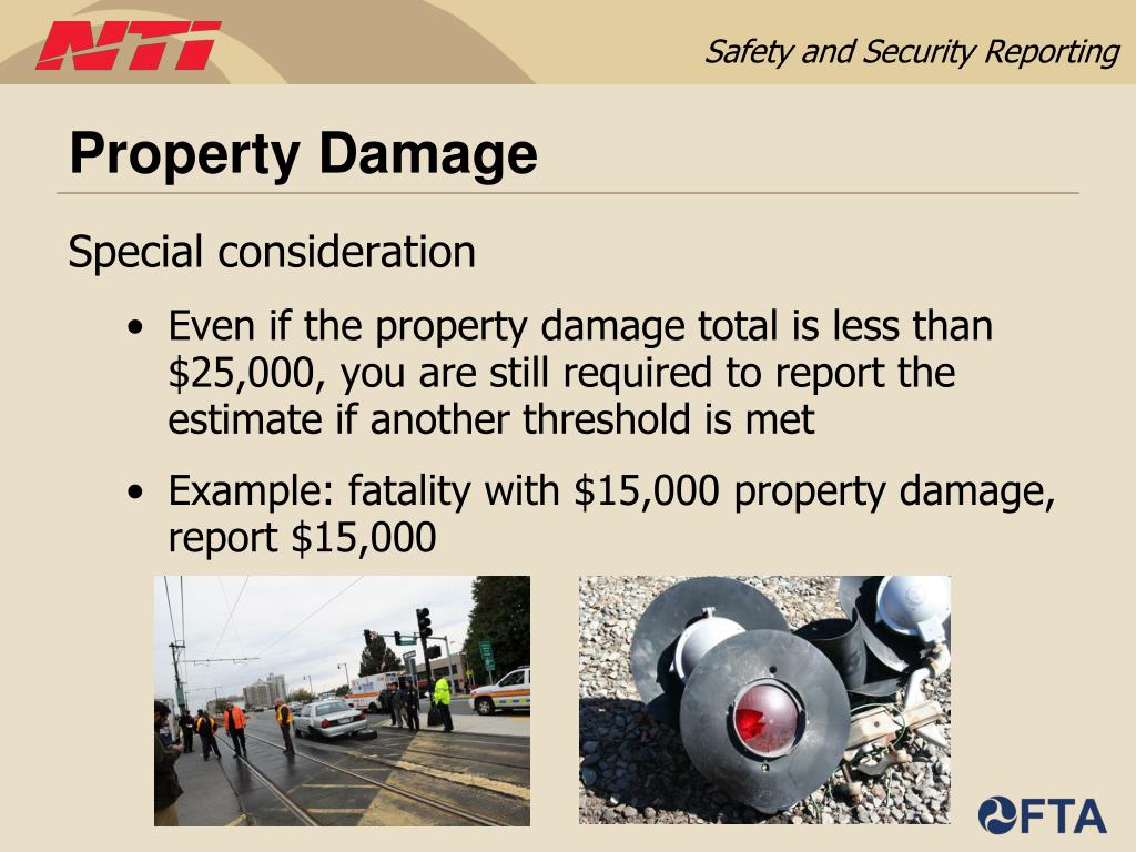 Property Damage • Incidents involving property damage equal to or exceeding $25,000 • Property damage includes, but is not limited to the following: • Transit and non-transit vehicle damage • Stations as well as non-transit facilities • Rights-of-way (ROW) and items surrounding ROW, such as utility poles • Estimated damage includes transit property damage, damage to other vehicles, and property involved in the incident that are not owned by the transit agency • Excludes private property (e.g., laptop, cell phone)
