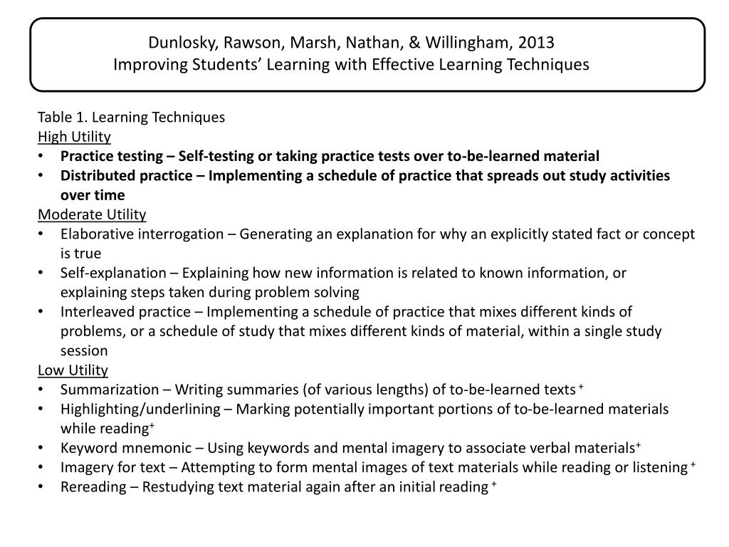 Dunlosky , Rawson, Marsh, Nathan, & Willingham, 2013 Improving Students’ Learning with Effective Learning Techniques. Table 1. Learning Techniques High Utility Practice testing – Self-testing or taking practice tests over to-be-learned material