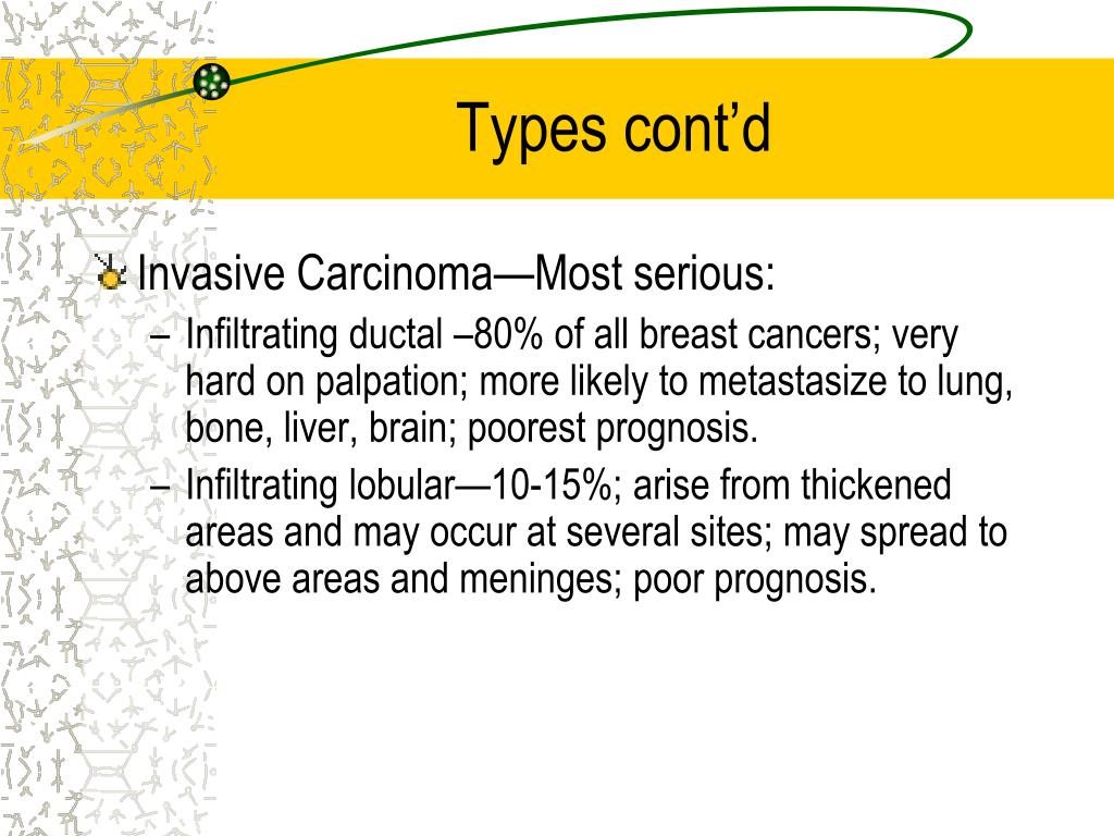 Types cont’d • Invasive Carcinoma—Most serious: • Infiltrating ductal –80% of all breast cancers; very hard on palpation; more likely to metastasize to lung, bone, liver, brain; poorest prognosis. • Infiltrating lobular—10-15%; arise from thickened areas and may occur at several sites; may spread to above areas and meninges; poor prognosis.