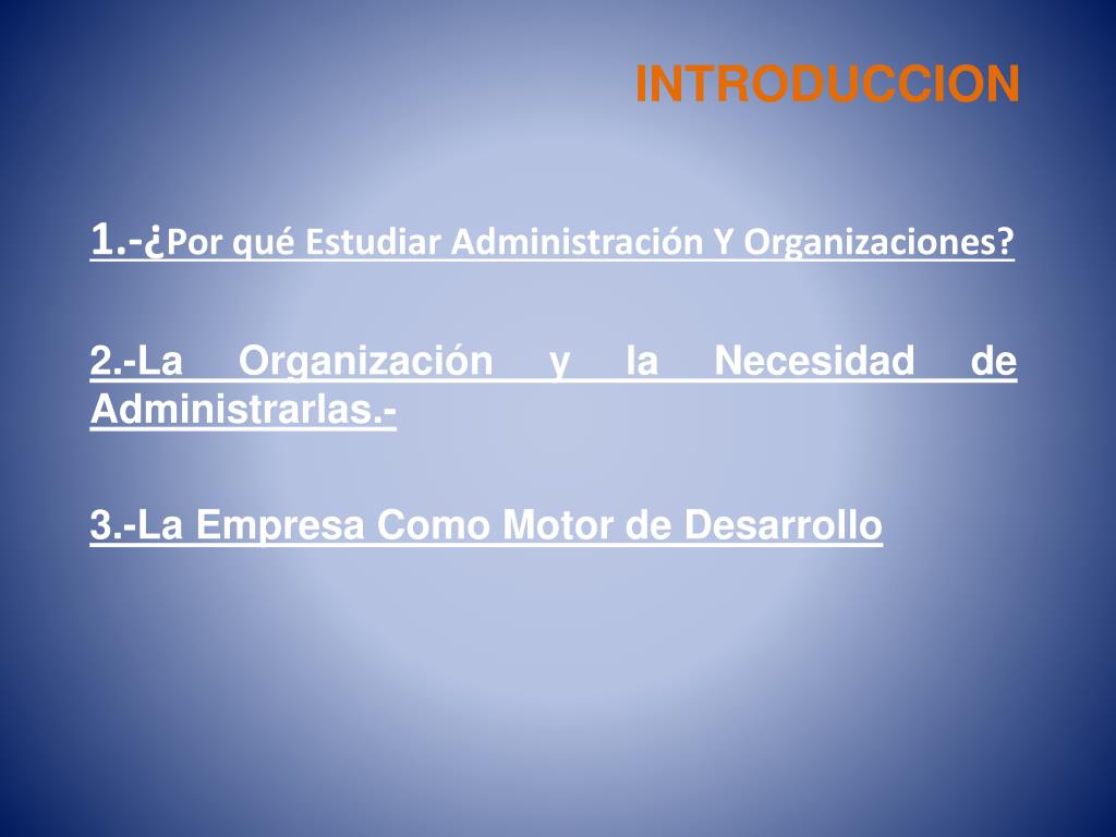 INTRODUCCION 1.-¿Por qué Estudiar Administración Y Organizaciones? 2.-La Organización y la Necesidad de Administrarlas.- 3.-La Empresa Como Motor de Desarrollo