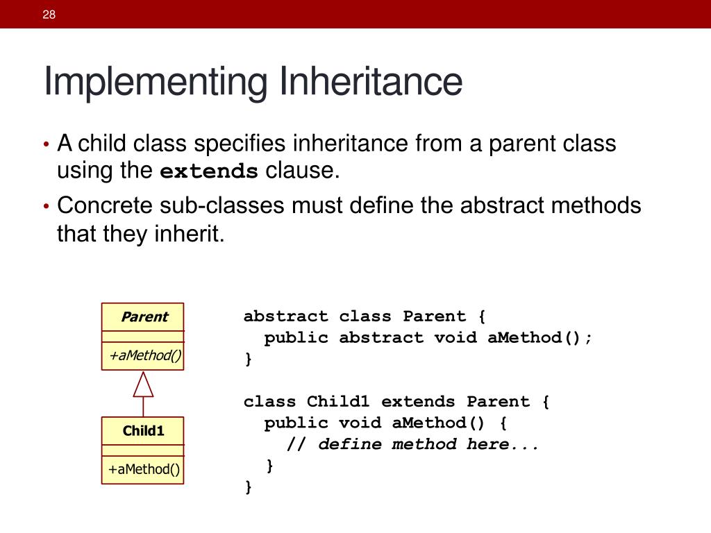 Implementing Inheritance • A child class specifies inheritance from a parent class using the extends clause. • Concrete sub-classes must define the abstract methods that they inherit. abstract class Parent { public abstract void aMethod(); } class Child1 extends Parent { public void aMethod() { // define method here... } }