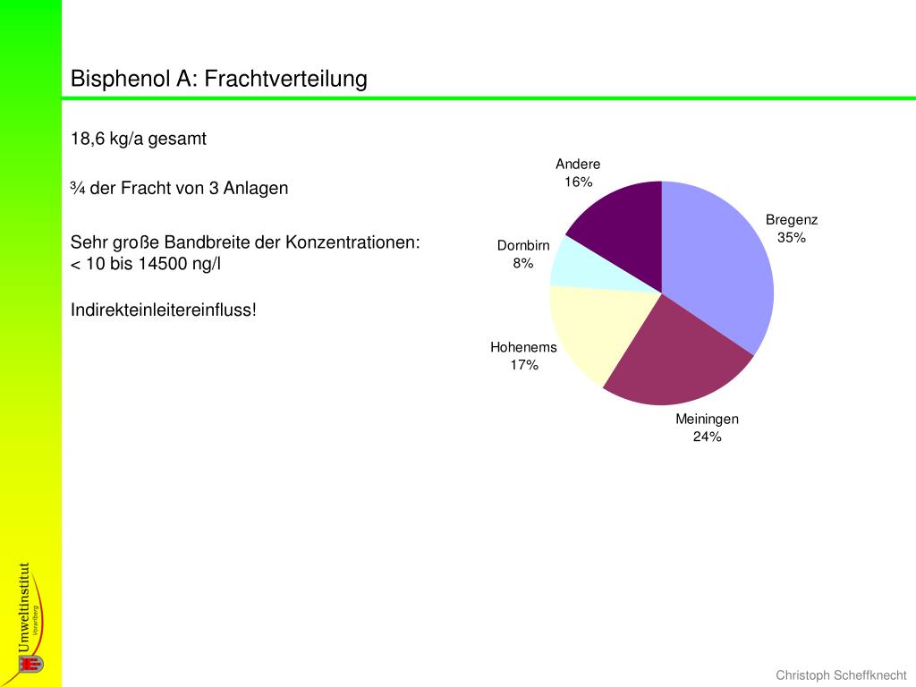 Bisphenol A: Frachtverteilung 18,6 kg/a gesamt ¾ der Fracht von 3 Anlagen Sehr große Bandbreite der Konzentrationen: < 10 bis 14500 ng/l Indirekteinleitereinfluss!