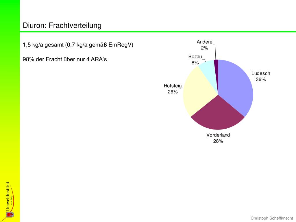 Diuron: Frachtverteilung 1,5 kg/a gesamt (0,7 kg/a gemäß EmRegV) 98% der Fracht über nur 4 ARA‘s