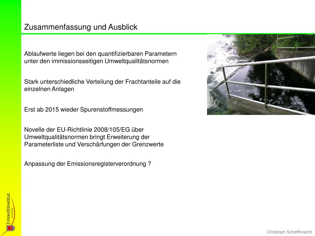 Zusammenfassung und Ausblick Ablaufwerte liegen bei den quantifizierbaren Parametern unter den immissionsseitigen Umweltqualitätsnormen Stark unterschiedliche Verteilung der Frachtanteile auf die einzelnen Anlagen Erst ab 2015 wieder Spurenstoffmessungen Novelle der EU-Richtlinie 2008/105/EG über Umweltqualitätsnormen bringt Erweiterung der Parameterliste und Verschärfungen der Grenzwerte Anpassung der Emissionsregisterverordnung ?