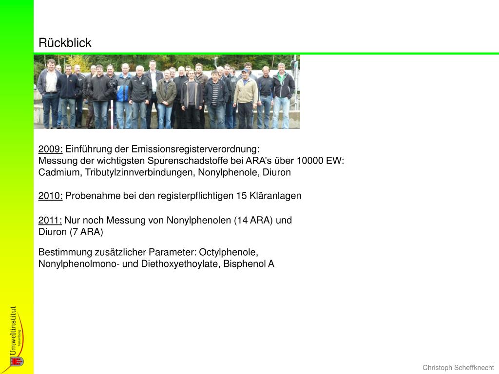 Rückblick 2009: Einführung der Emissionsregisterverordnung: Messung der wichtigsten Spurenschadstoffe bei ARA’s über 10000 EW: Cadmium, Tributylzinnverbindungen, Nonylphenole, Diuron 2010: Probenahme bei den registerpflichtigen 15 Kläranlagen 2011: Nur noch Messung von Nonylphenolen (14 ARA) und Diuron (7 ARA) Bestimmung zusätzlicher Parameter: Octylphenole, Nonylphenolmono- und Diethoxyethoylate, Bisphenol A