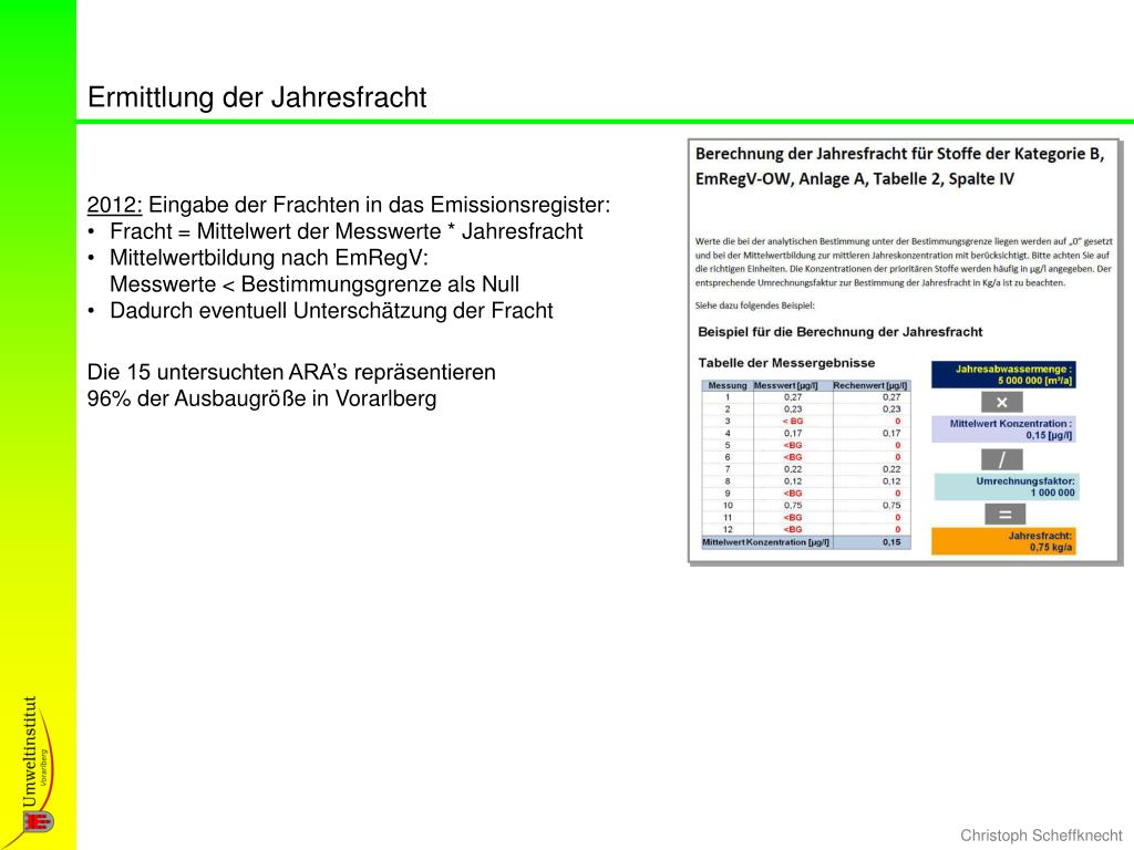 Ermittlung der Jahresfracht • 2012: Eingabe der Frachten in das Emissionsregister: • Fracht = Mittelwert der Messwerte * Jahresfracht • Mittelwertbildung nach EmRegV: • Messwerte < Bestimmungsgrenze als Null • Dadurch eventuell Unterschätzung der Fracht Die 15 untersuchten ARA’s repräsentieren 96% der Ausbaugröße in Vorarlberg