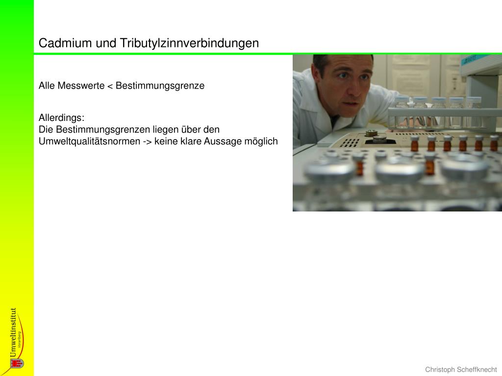 Cadmium und Tributylzinnverbindungen Alle Messwerte < Bestimmungsgrenze Allerdings: Die Bestimmungsgrenzen liegen über den Umweltqualitätsnormen -> keine klare Aussage möglich