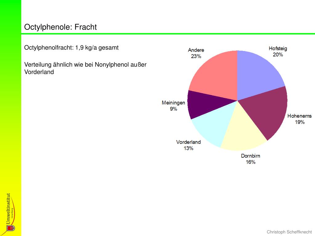 Octylphenole: Fracht Octylphenolfracht: 1,9 kg/a gesamt Verteilung ähnlich wie bei Nonylphenol außer Vorderland