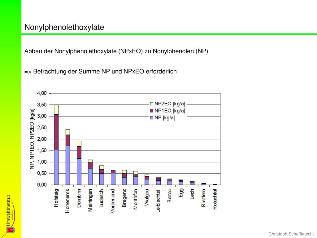 Nonylphenolethoxylate Abbau der Nonylphenolethoxylate (NPxEO) zu Nonylphenolen (NP) => Betrachtung der Summe NP und NPxEO erforderlich