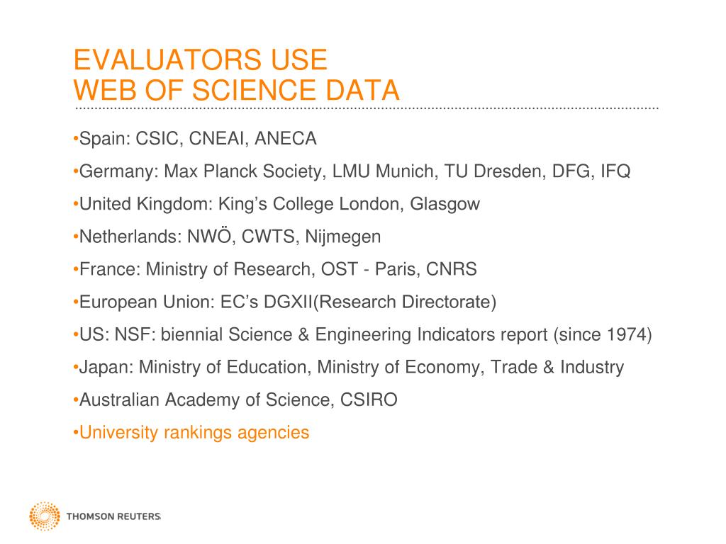 EVALUATORS USEWEB OF SCIENCE DATA Spain: CSIC, CNEAI, ANECA Germany: Max Planck Society, LMU Munich, TU Dresden, DFG, IFQ United Kingdom: King’s College London, Glasgow Netherlands: NWÖ, CWTS, Nijmegen France: Ministry of Research, OST - Paris, CNRS European Union: EC’s DGXII(Research Directorate) US: NSF: biennial Science & Engineering Indicators report (since 1974) Japan: Ministry of Education, Ministry of Economy, Trade & Industry Australian Academy of Science, CSIRO University rankings agencies