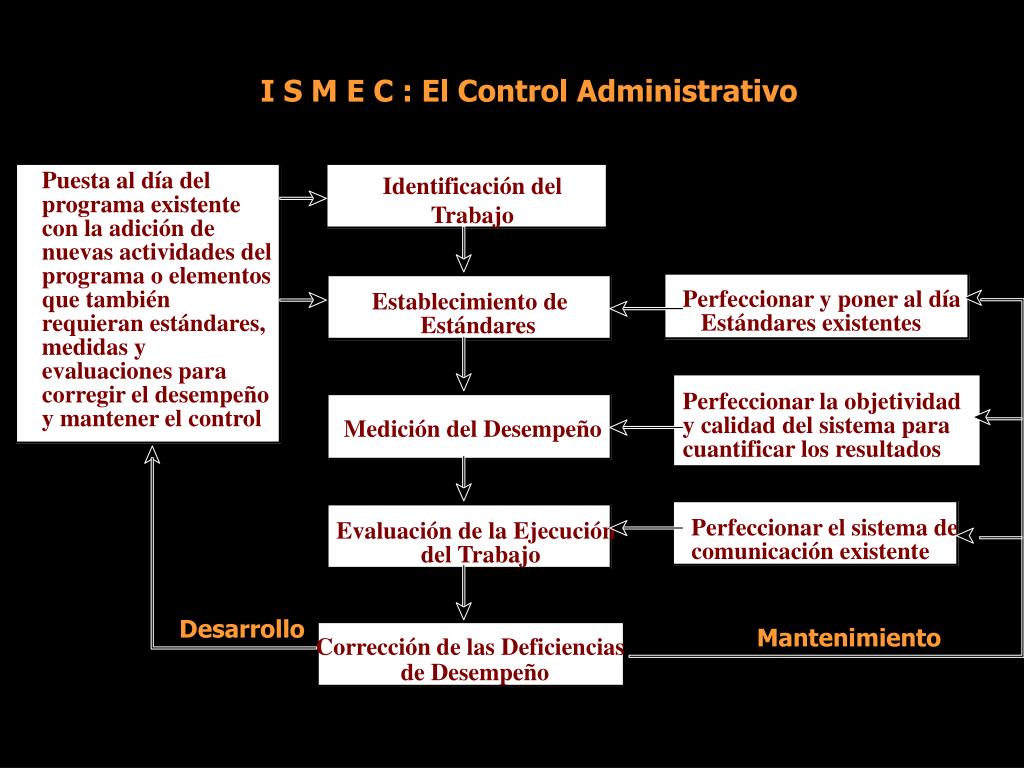 I S M E C : El Control Administrativo Puesta al día del Identificación del Trabajo programa existente con la adición de nuevas actividades del programa o elementos Perfeccionar y poner al día que también Establecimiento de Estándares existentes requieran estándares, Estándares medidas y evaluaciones para corregir el desempeño Perfeccionar la objetividad y mantener el control y calidad del sistema para Medición del Desempeño cuantificar los resultados Perfeccionar el sistema de Evaluación de la Ejecución comunicación existente del Trabajo Desarrollo Mantenimiento Corrección de las Deficiencias de Desempeño