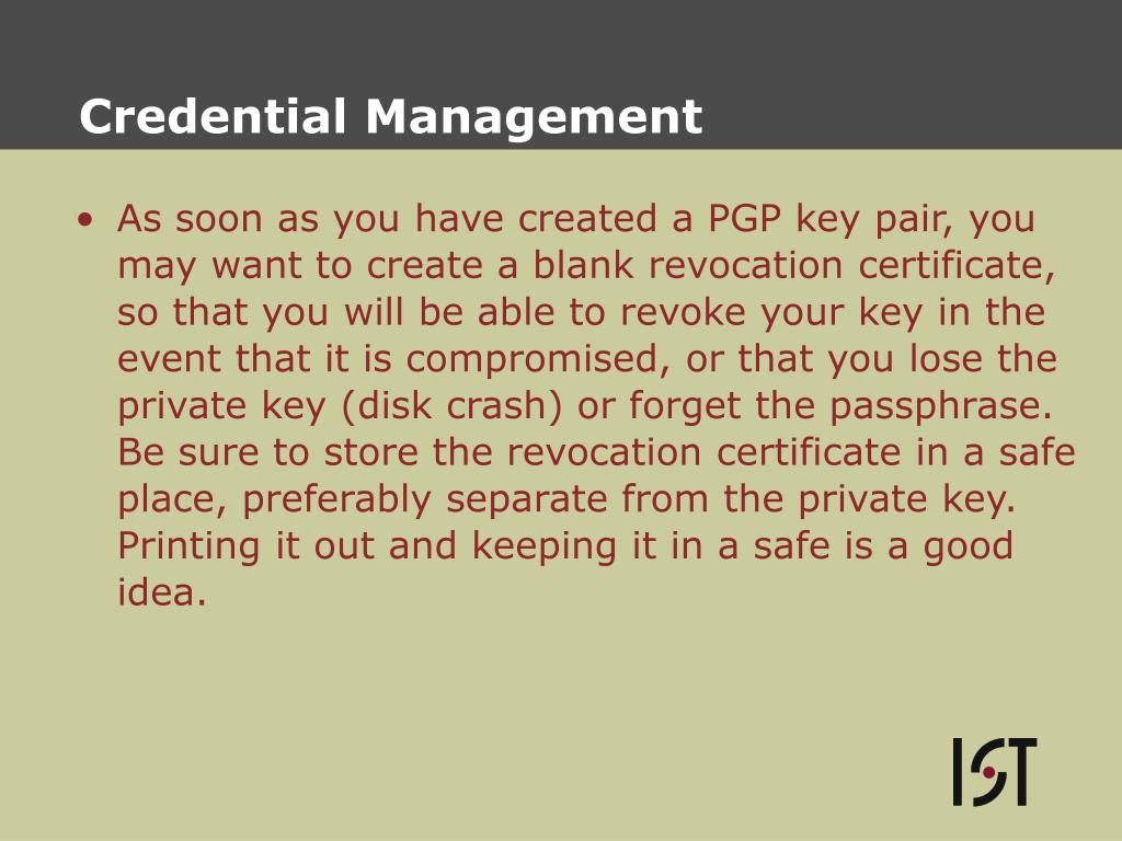 Credential Management • As soon as you have created a PGP key pair, you may want to create a blank revocation certificate, so that you will be able to revoke your key in the event that it is compromised, or that you lose the private key (disk crash) or forget the passphrase. Be sure to store the revocation certificate in a safe place, preferably separate from the private key. Printing it out and keeping it in a safe is a good idea.
