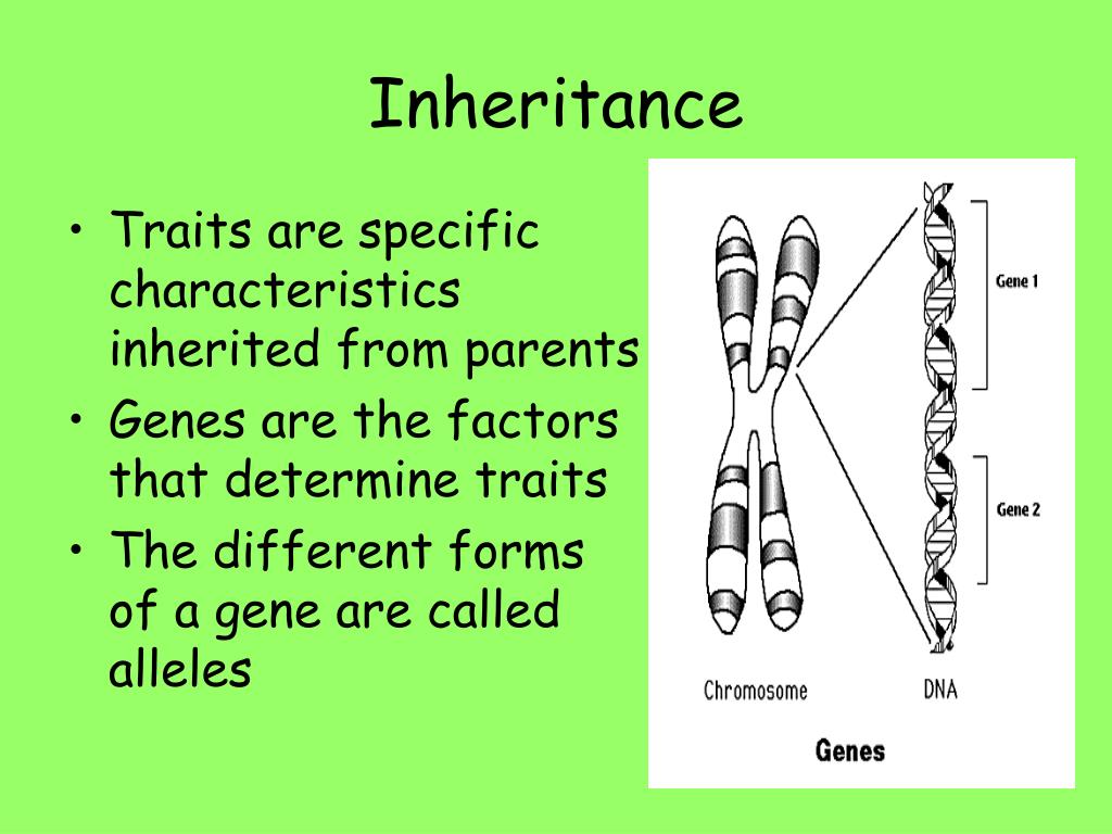 Inheritance • Traits are specific characteristics inherited from parents • Genes are the factors that determine traits • The different forms of a gene are called alleles
