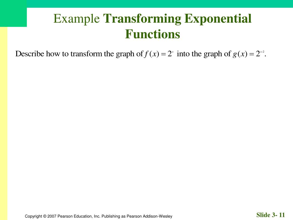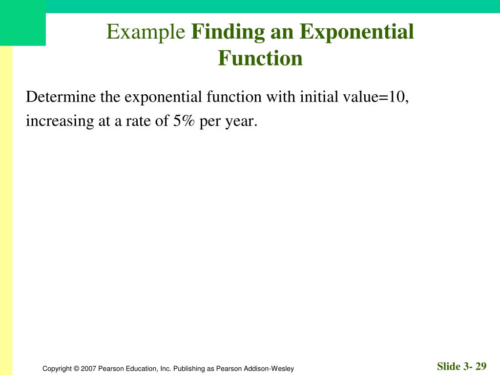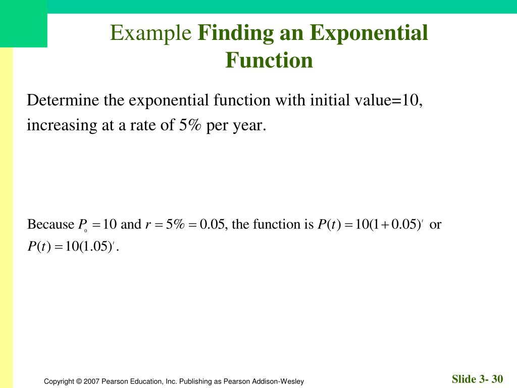 Example Finding an Exponential Function Determine the exponential function with initial value=10, increasing at a rate of 5% per year.