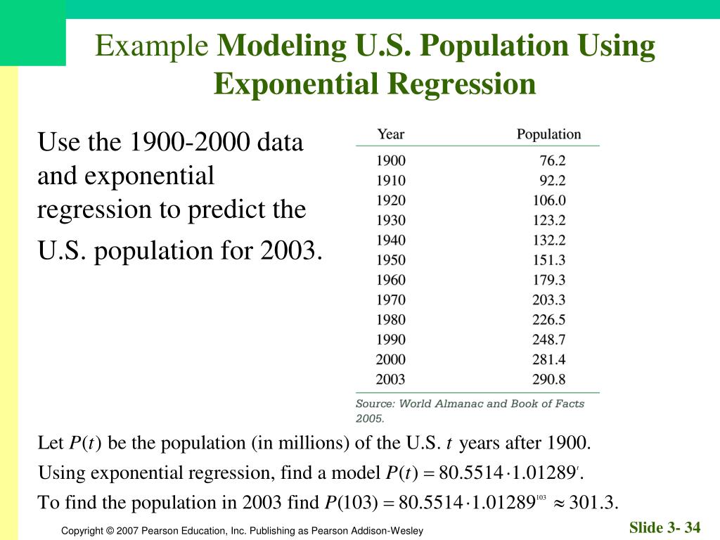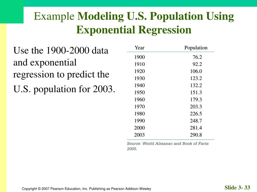Example Modeling U.S. Population Using Exponential Regression Use the 1900-2000 data and exponential regression to predict the U.S. population for 2003.