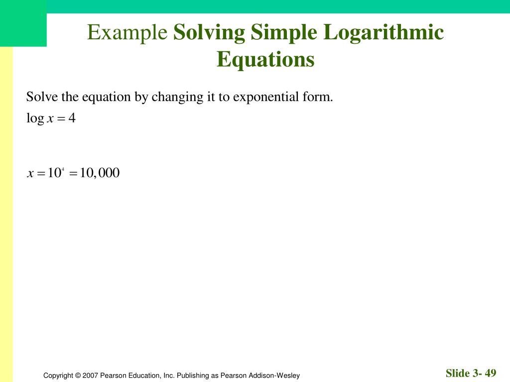 Common Logarithm – Base 10 • Logarithms with base 10 are called common logarithms. • The common logarithm log10x = log x. • The common logarithm is the inverse of the exponential function y = 10x.