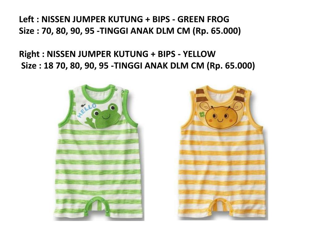 Left : NISSEN JUMPER KUTUNG + BIPS - GREEN FROG Size : 70, 80, 90, 95 -TINGGI ANAK DLM CM (Rp. 65.000)Right : NISSEN JUMPER KUTUNG + BIPS - YELLOW Size : 18 70, 80, 90, 95 -TINGGI ANAK DLM CM (Rp. 65.000)