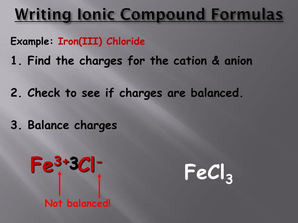 Writing Ionic Compound Formulas Example: Iron(III) Chloride 1. Find the charges for the cation & anion 2. Check to see if charges are balanced. 3. Balance charges Fe3+ Cl- 3 FeCl3 Not balanced!