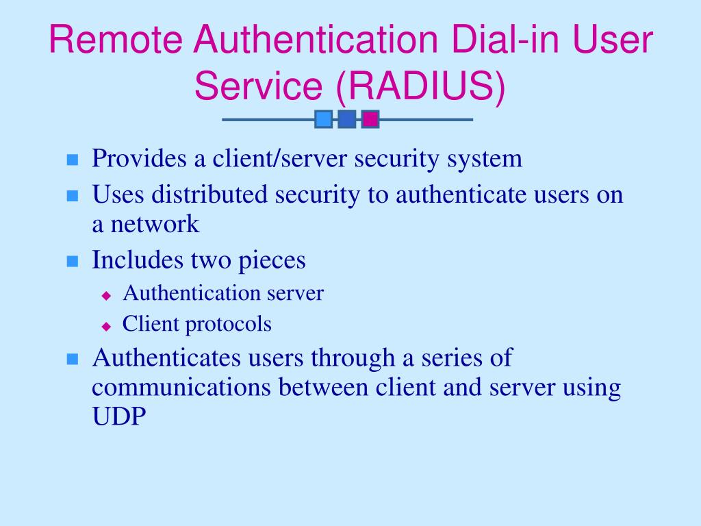 Remote Authentication Dial-in User Service (RADIUS) • Provides a client/server security system • Uses distributed security to authenticate users on a network • Includes two pieces • Authentication server • Client protocols • Authenticates users through a series of communications between client and server using UDP
