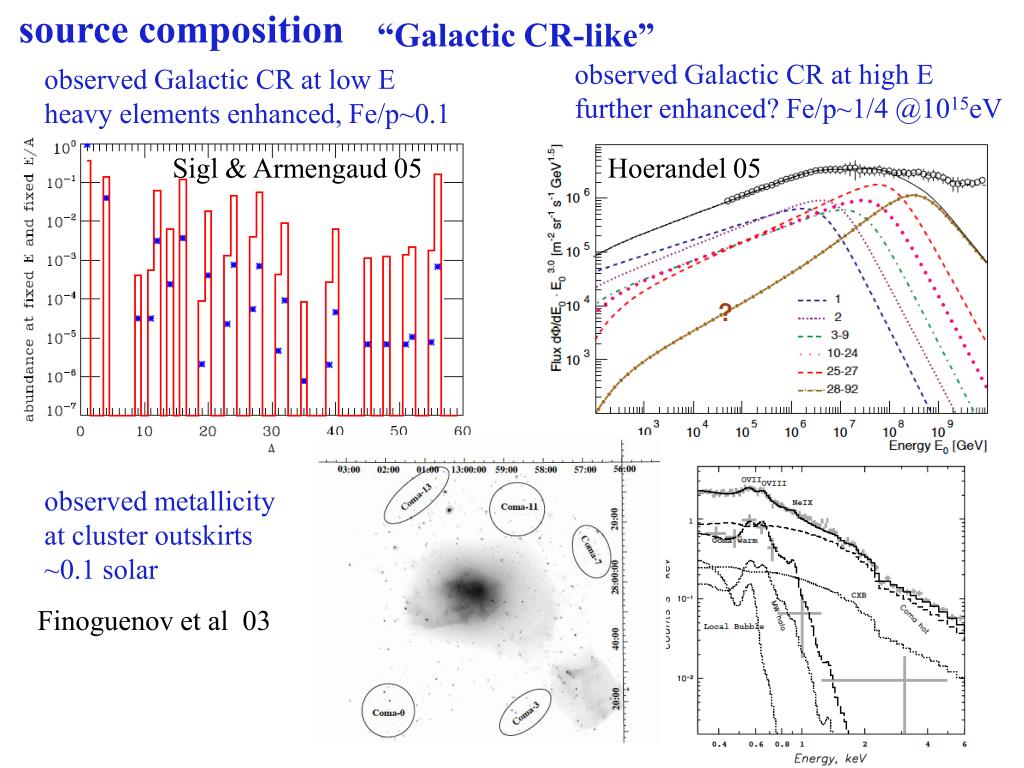 “Galactic CR-like” observed Galactic CR at high E further enhanced? Fe/p~1/4 @1015eV observed Galactic CR at low E heavy elements enhanced, Fe/p~0.1 source composition Sigl & Armengaud 05 Hoerandel 05 observed metallicity at cluster outskirts ~0.1 solar Finoguenov et al 03