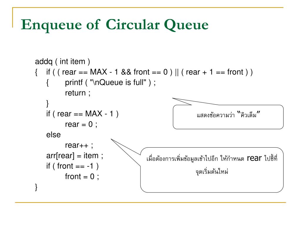 Enqueue of Circular Queue addq ( int item ) { if ( ( rear == MAX - 1 && front == 0 ) || ( rear + 1 == front ) ) { printf ( "\nQueue is full" ) ; return ; } if ( rear == MAX - 1 ) rear = 0 ; else rear++ ; arr[rear] = item ; if ( front == -1 ) front = 0 ; } แสดงข้อความว่า “คิวเต็ม” เมื่อต้องการเพิ่มข้อมูลเข้าไปอีก ให้กำหนด rear ไปชี้ที่จุดเริ่มต้นใหม่