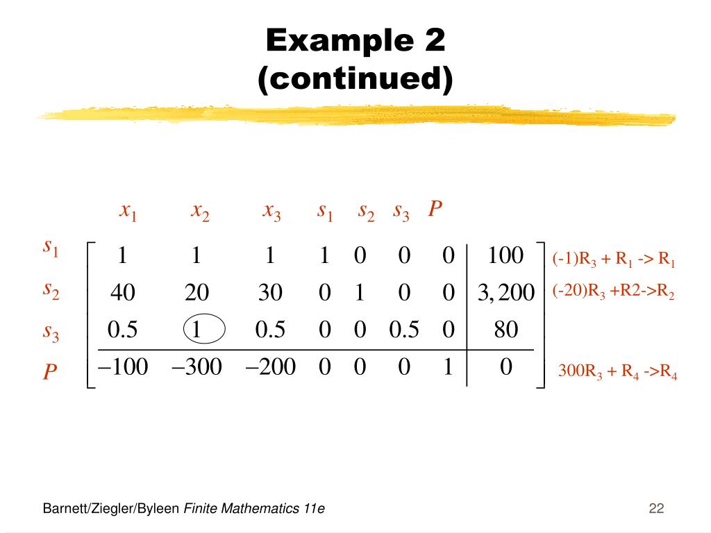 Example 2(continued) x1x2x3s1s2s3P s1 s2 x2 P (-20)R1 + R2 -> R2 (-0.5)R1 + R3 -> R3 50R1 + R4 -> R4 Barnett/Ziegler/Byleen Finite Mathematics 11e