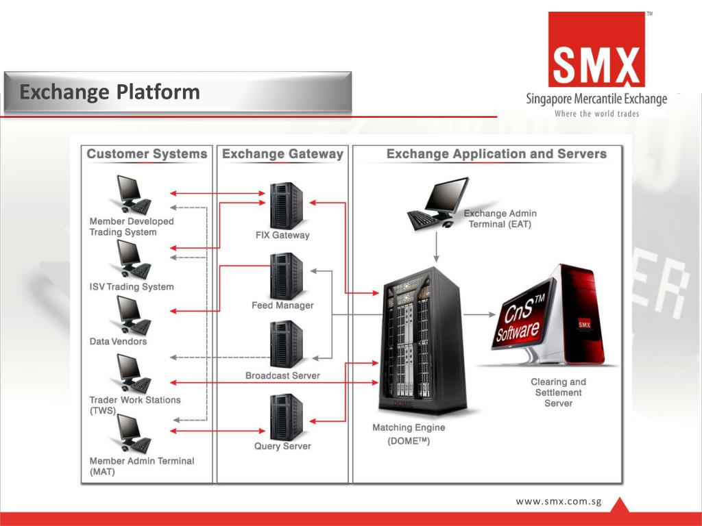 OurExchange Global commodities exchange based in Singapore A Member of Financial Technologies Group Market leader in technology solutions, domain expertise across all asset classesEstablished, tried and tested organisation Behind some of the most successful exchanges in India, Asia and Middle East, including MCX, MCX-SX, NSEL, IEX, DGCX and newly launched Bourse Africa, GBOT and Bahrain Financial Exchange www.smx.com.sg