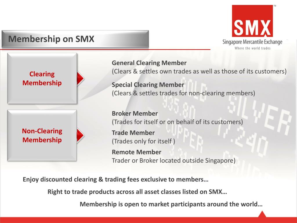 Membership on SMX Clearing Membership General Clearing Member(Clears & settles own trades as well as those of its customers) Special Clearing Member (Clears & settles trades for non-clearing members) Broker Member (Trades for itself or on behalf of its customers) Trade Member (Trades only for itself ) Remote MemberTrader or Broker located outside Singapore) Non-Clearing Membership Enjoy discounted clearing & trading fees exclusive to members… Right to trade products across all asset classes listed on SMX… Membership is open to market participants around the world…