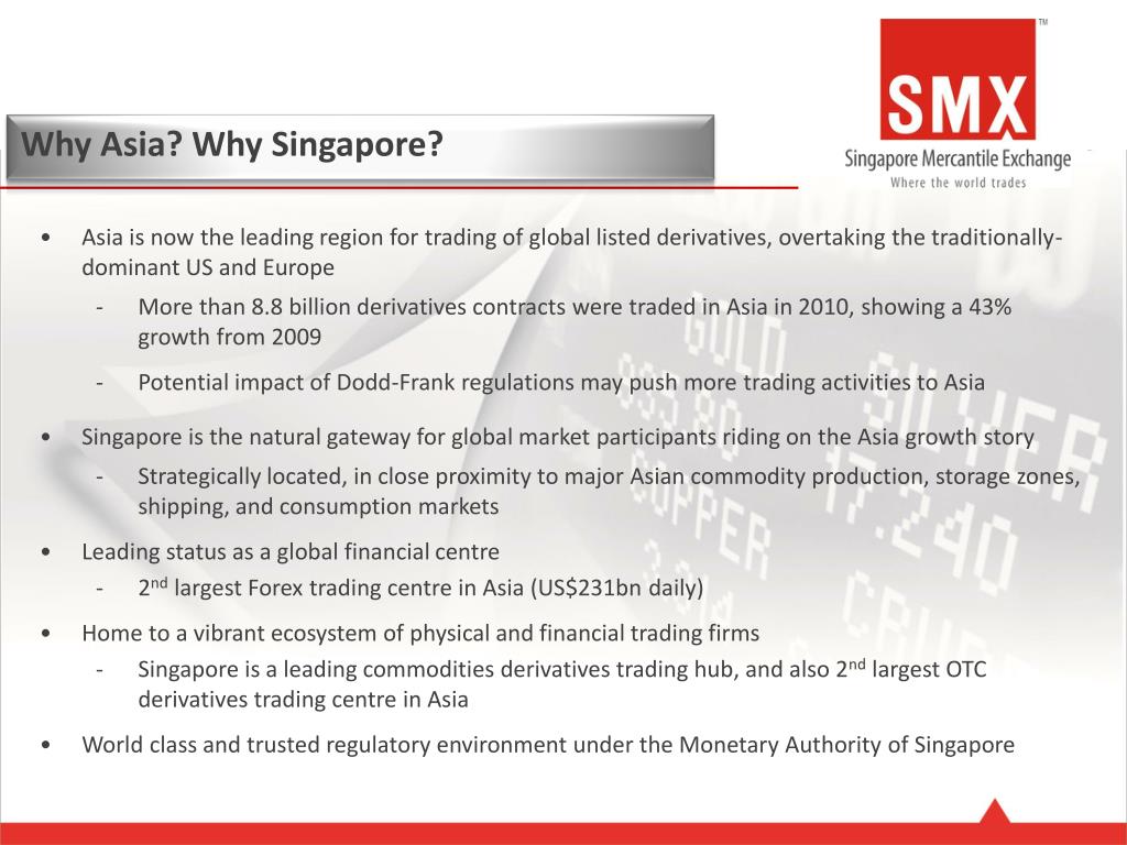 Why Asia? Why Singapore? • Asia is now the leading region for trading of global listed derivatives, overtaking the traditionally-dominant US and Europe • More than 8.8 billion derivatives contracts were traded in Asia in 2010, showing a 43% growth from 2009 • Potential impact of Dodd-Frank regulations may push more trading activities to Asia • Singapore is the natural gateway for global market participants riding on the Asia growth story • Strategically located, in close proximity to major Asian commodity production, storage zones, shipping, and consumption markets • Leading status as a global financial centre • 2nd largest Forex trading centre in Asia (US$231bn daily) • Home to a vibrant ecosystem of physical and financial trading firms • Singapore is a leading commodities derivatives trading hub, and also 2nd largest OTC derivatives trading centre in Asia • World class and trusted regulatory environment under the Monetary Authority of Singapore