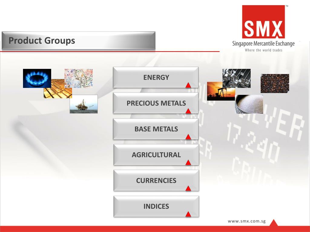 Product Groups ENERGY PRECIOUS METALS BASE METALS AGRICULTURAL CURRENCIES INDICES www.smx.com.sg