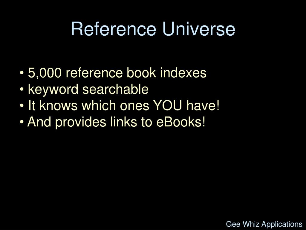 Reference Universe • 5,000 reference book indexes • keyword searchable • It knows which ones YOU have! • And provides links to eBooks! Gee Whiz Applications