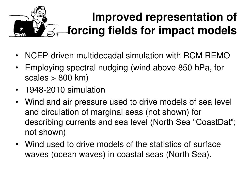 Improved representation of forcing fields for impact models • NCEP-driven multidecadal simulation with RCM REMO • Employing spectral nudging (wind above 850 hPa, for scales > 800 km) • 1948-2010 simulation • Wind and air pressure used to drive models of sea level and circulation of marginal seas (not shown) for describing currents and sea level (North Sea “CoastDat”; not shown) • Wind used to drive models of the statistics of surface waves (ocean waves) in coastal seas (North Sea).