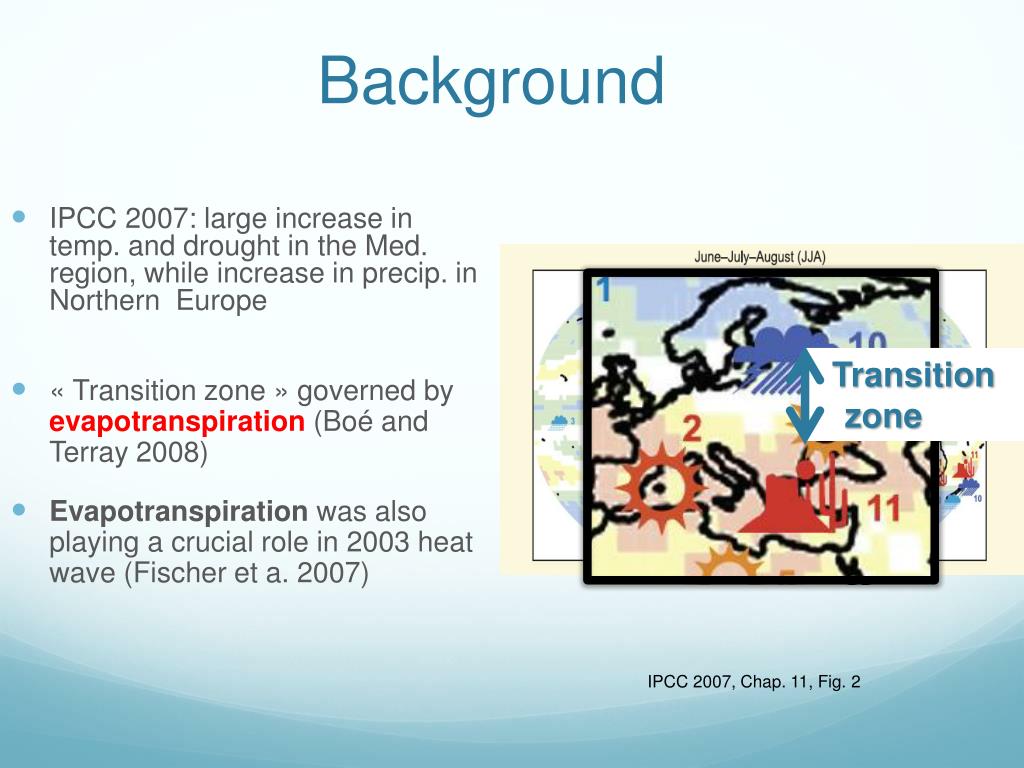 Background • IPCC 2007: large increase in temp. and drought in the Med. region, whileincrease in precip. in Northern Europe • « Transition zone » governed by evapotranspiration (Boé and Terray 2008) • Evapotranspirationwasalsoplaying a crucial role in 2003 heatwave (Fischer et a. 2007) Transition zone IPCC 2007, Chap. 11, Fig. 2