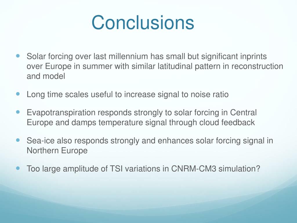 Conclusions • Solar forcing over last millennium has small but significantinprints over Europe in summerwithsimilar latitudinal pattern in reconstruction and model • Long time scalesuseful to increase signal to noise ratio • Evapotranspiration respondsstrongly to solar forcing in Central Europe and dampstemperature signal throughcloud feedback • Sea-icealsorespondsstrongly and enhancessolar forcing signal in Northern Europe • Too large amplitude of TSI variations in CNRM-CM3 simulation?