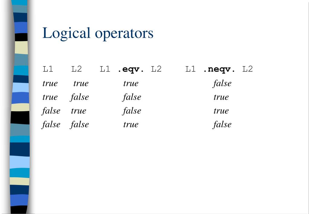 Logical operators L1 L2 L1 .eqv. L2 L1 .neqv. L2 true true true false true false false true false true false true false false true false