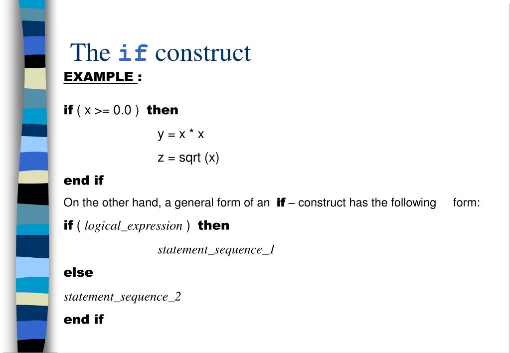 The if construct EXAMPLE : if ( x >= 0.0 ) then y = x * x z = sqrt (x) end if On the other hand, a general form of an if – construct has the following form: if ( logical_expression ) then statement_sequence_1 else statement_sequence_2 end if