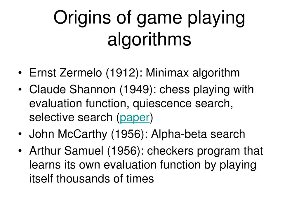 Origins of game playing algorithms • Ernst Zermelo (1912): Minimax algorithm • Claude Shannon (1949): chess playing with evaluation function, quiescence search, selective search (paper) • John McCarthy (1956): Alpha-beta search • Arthur Samuel (1956): checkers program that learns its own evaluation function by playing itself thousands of times