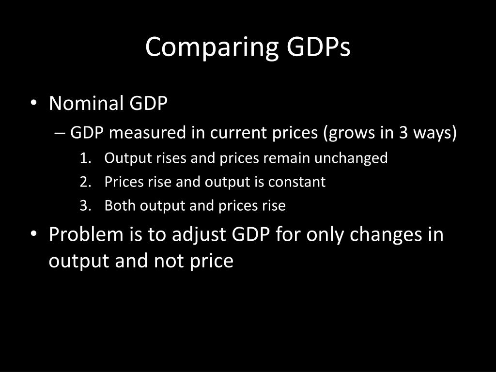 Comparing GDPs • Nominal GDP • GDP measured in current prices (grows in 3 ways) • Output rises and prices remain unchanged • Prices rise and output is constant • Both output and prices rise • Problem is to adjust GDP for only changes in output and not price