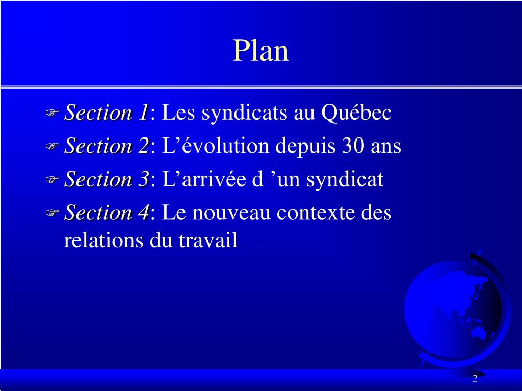 Plan • Section 1: Les syndicats au Québec • Section 2: L’évolution depuis 30 ans • Section 3: L’arrivée d ’un syndicat • Section 4: Le nouveau contexte des relations du travail