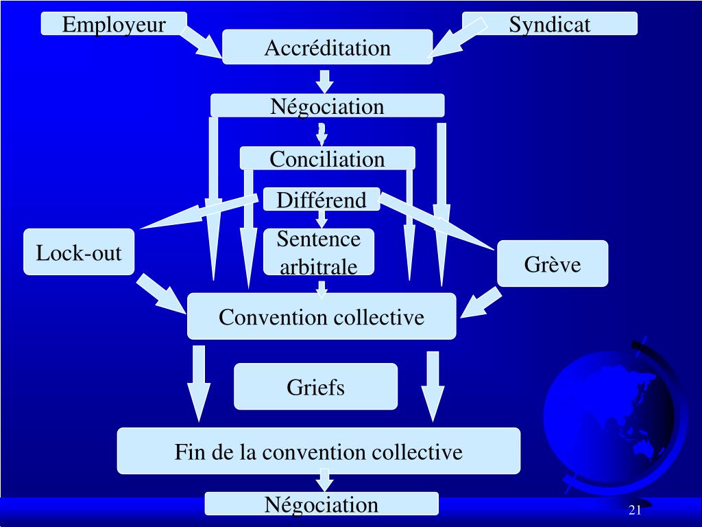 Employeur Syndicat Accréditation Négociation Conciliation Différend Lock-out Sentence arbitrale Grève Convention collective Griefs Fin de la convention collective Négociation
