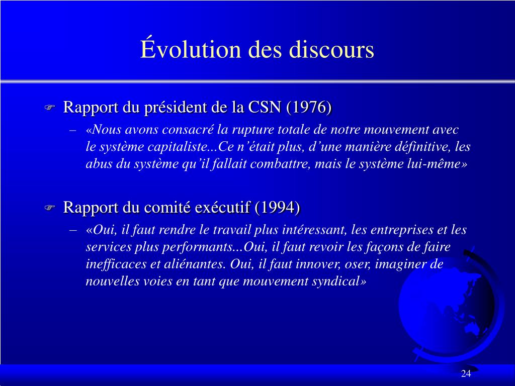Évolution des discours • Rapport du président de la CSN (1976) • «Nous avons consacré la rupture totale de notre mouvement avec le système capitaliste...Ce n’était plus, d’une manière définitive, les abus du système qu’il fallait combattre, mais le système lui-même» • Rapport du comité exécutif (1994) • «Oui, il faut rendre le travail plus intéressant, les entreprises et les services plus performants...Oui, il faut revoir les façons de faire inefficaces et aliénantes. Oui, il faut innover, oser, imaginer de nouvelles voies en tant que mouvement syndical»