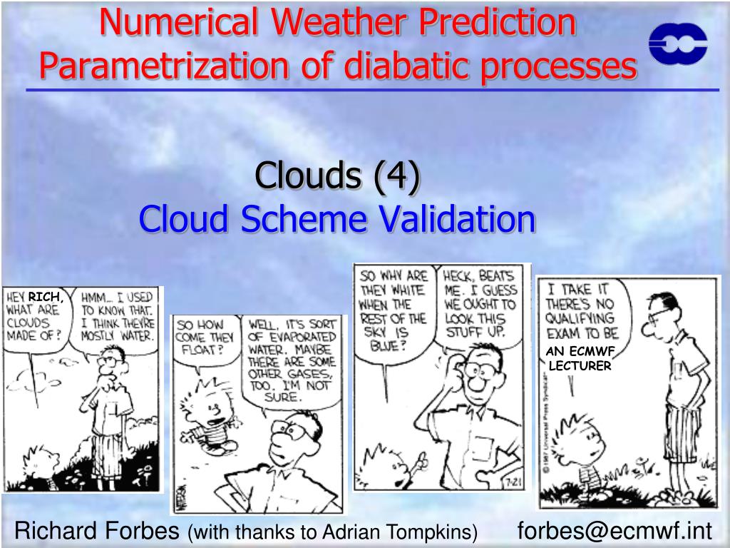 RICH, AN ECMWF LECTURER Numerical Weather Prediction Parametrization of diabatic processesClouds (4)Cloud Scheme Validation Richard Forbes (with thanks to Adrian Tompkins) forbes@ecmwf.int