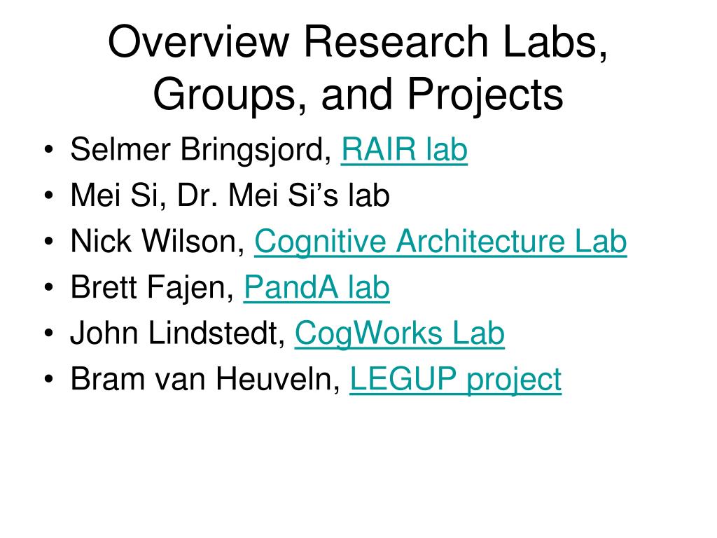 Overview Research Labs, Groups, and Projects • Selmer Bringsjord, RAIR lab • Mei Si, Dr. Mei Si’s lab • Nick Wilson, Cognitive Architecture Lab • Brett Fajen, PandAlab • John Lindstedt, CogWorks Lab • Bram van Heuveln, LEGUP project
