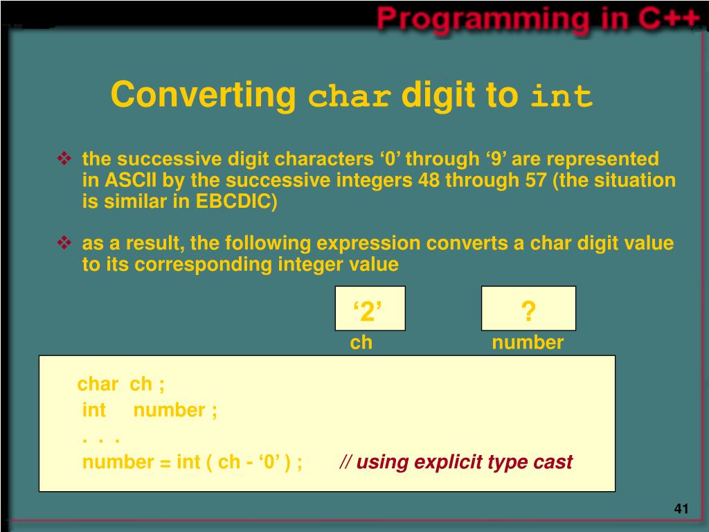Converting chardigit to int • the successive digit characters ‘0’ through ‘9’ are represented in ASCII by the successive integers 48 through 57 (the situation is similar in EBCDIC) • as a result, the following expression converts a char digit value to its corresponding integer value ‘2’? ch number char ch ; int number ; . . . number = int ( ch - ‘0’ ) ; // using explicit type cast