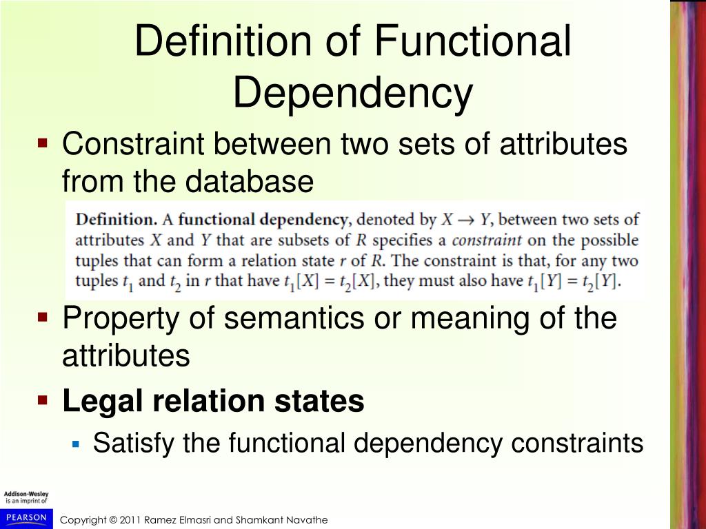 Definition of Functional Dependency • Constraint between two sets of attributes from the database • Property of semantics or meaning of the attributes • Legal relation states • Satisfy the functional dependency constraints