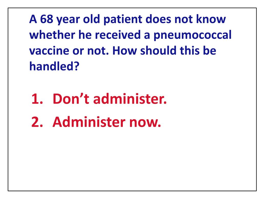 A 68 year old patient does not know whether he received a pneumococcal vaccine or not. How should this be handled? • Don’t administer. • Administer now.