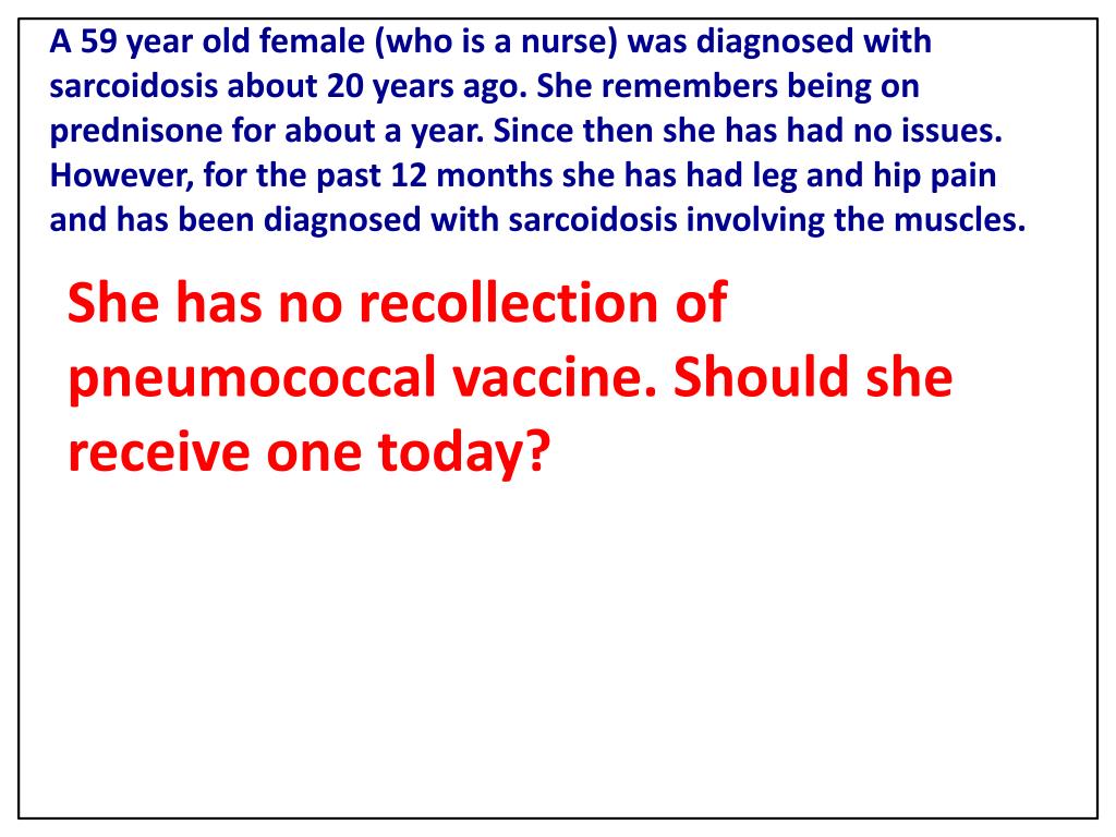 A 59 year old female (who is a nurse) was diagnosed with sarcoidosis about 20 years ago. She remembers being on prednisone for about a year. Since then she has had no issues. However, for the past 12 months she has had leg and hip pain and has been diagnosed with sarcoidosis involving the muscles. She has no recollection of pneumococcal vaccine. Should she receive one today?