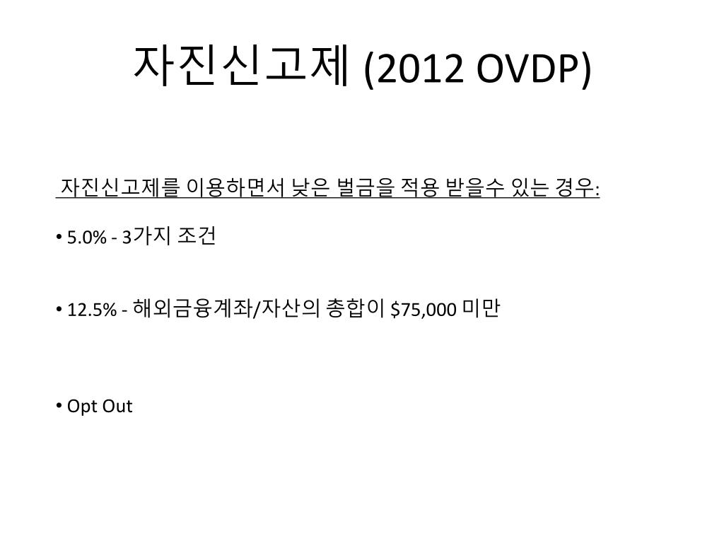 자진신고제 (2012 OVDP) • 자진신고제를 이용하면서 낮은 벌금을 적용 받을수 있는 경우: • 5.0% - 3가지 조건 • 12.5% - 해외금융계좌/자산의 총합이 $75,000 미만 • Opt Out