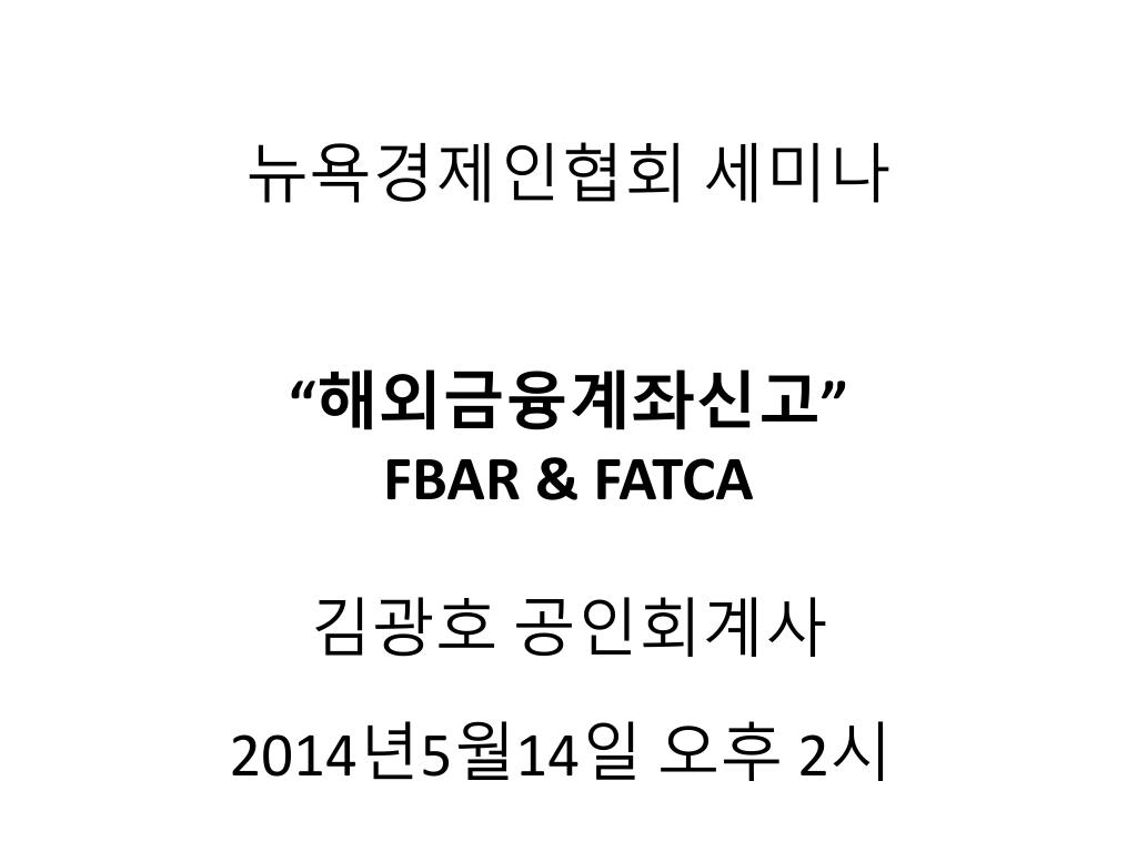 Kwang Ho Kim CPA. 김광호 공인회계사. (201) 947-0604 / Email: kkhcpa@hotmail.com @ Fort Lee 명동칼국수 옆건물 BBCN 뱅크 2 층. 뉴욕경제인협회 세미나 “ 해외금융계좌신고 ” FBAR & FATCA 김광호 공인회계사. 2014 년 5 월 14 일 오후 2 시. DISCLAIMER. This is not a legal or tax advise.