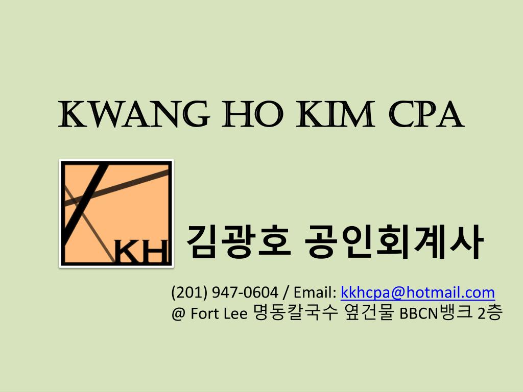 Kwang Ho Kim CPA 김광호 공인회계사 (201) 947-0604 / Email: kkhcpa@hotmail.com @ Fort Lee 명동칼국수 옆건물 BBCN뱅크 2층